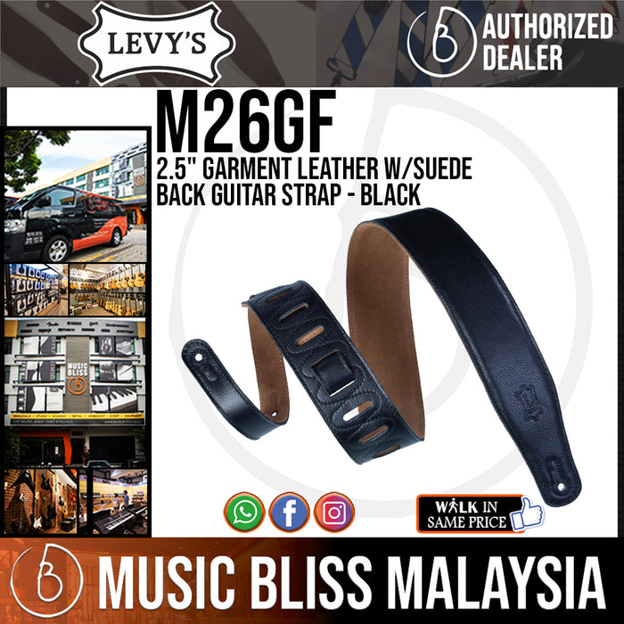 Levy's makes genuine top grain leather guitar straps. The M26 is simple but of the highest quality. With a black finish and 2 1/2" width, the M26 features a neutral back to reduce color migration. It's adjustable from 44" to 53".