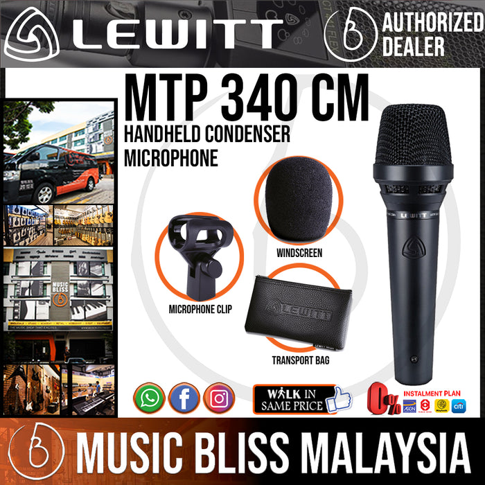The Lewitt MTP 340 CM Handheld Condenser Microphone is a rugged cardioid microphone intended for general speech and performance applications. The cardioid polar pattern features a uniform frequency response while effectively minimizing off-axis noise and feedback. The microphone features solid die-cast construction and a steel mesh grill. The microphone ships in a cardboard box and includes a shockmount and a zippered storage pouch.