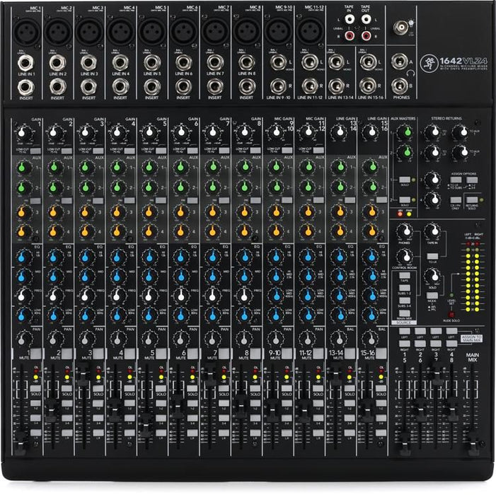 Beyond sounding great, the Mackie 1642VLZ4 mixer is one piece of gear you can truly rely on. It continues the VLZ Series' trend for rock-solid construction, while taking your sound quality to a new level. You've got an amazingly wide dynamic range, incredible 60dB gain range on the Onyx microphone preamplifiers, and ultra-low-noise performance. The 1642VLZ4 also boasts better-than-ever RF rejection for prime performance in broadcast situations. And with high-resolution meters, generous I/O, and sealed rotary controls that keep out dust and grime, the Mackie 1642VLZ4 is one of Mackie's best mixers ever.
