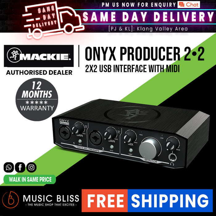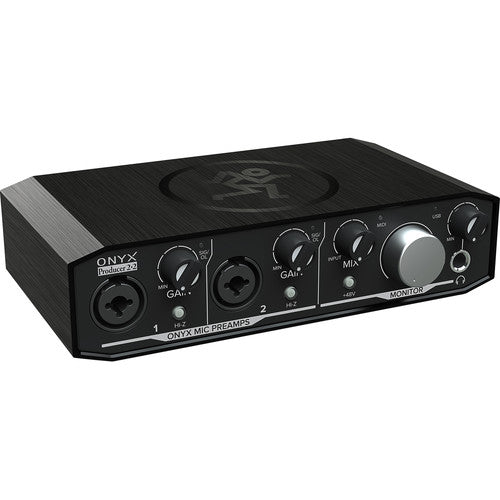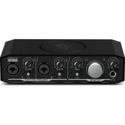 Singer/songwriters and content creators will love the Mackie Onyx Producer 2-2. High-resolution 24-bit/192kHz converters combine with premium analog circuitry to deliver top-notch sound. A pair of boutique-sounding Onyx mic preamps provides excellent fidelity and dynamic range, while their XLR/TRS combo inputs accommodate just about everything. You also get a hi-Z switch on each channel for DI-ing your guitar or bass. Zero-latency direct monitoring and a headphone output make tracking a breeze. And you can hook up your synths, controllers, and other hardware with ease, thanks to built-in MIDI connectivity. Bus-powered for the ultimate in portability, the Onyx Producer 2-2 is a great way to capture any performance.