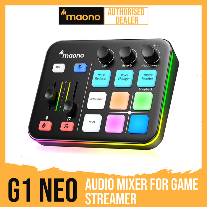 The Maonocaster G1 Neo Gaming Audio Mixer is the newest innovation in the acclaimed Maonocaster series. Featuring an eye-catching RGB lighting design, the G1 Neo delivers superior audio performance while enhancing the visual appeal of your gaming and streaming setup. Its compact design allows for seamless integration into any workspace. enjoy game streaming at ease.