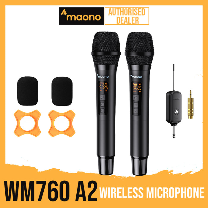 Maono WM760 handheld wireless dynamic microphone system consists of a handheld microphone and receiver. The system features plug-and-play easy operation, clear sound, reliable connection and a nice looking. The system is with a range of up to 80 meters and is specially designed for home parties, karaoke singing, presentations and meetings. The handheld microphone is powered by 2 AA universal batteries, which are easy to purchase and replace. The receiver has a 6.35mm microphone input plug, which can be easily plugged into the speaker for amplification. The system has 20 communication channels in different frequency, which effectively avoid signal interference and deliver clearer sound. The product is equipped with an LED screen that can display status information in real time. There are single microphone and dual microphone versions available for users to choose according to different needs.