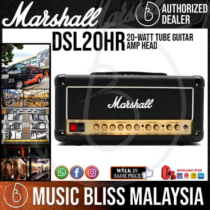 Tap into burly Marshall tone anywhere from your bedroom to the stagewith the Marshall DSL20HR tube amp head. With per-channel Gain and Volume controlsa dedicated Resonance controlreverband an effects loopthe DSL20HR is ready to rock. And with its adjustable power levelyou can dial in cranked-amp tones that won wake your neighbors ? or even use the Softube speaker-emulated output for direct recording and monitoring. Marshall even refined the EQ section for extremely versatile tone shaping. From glassy cleans to bone-rattling crunch to blistering high gainyour wish is the Marshall DSL20HR command.