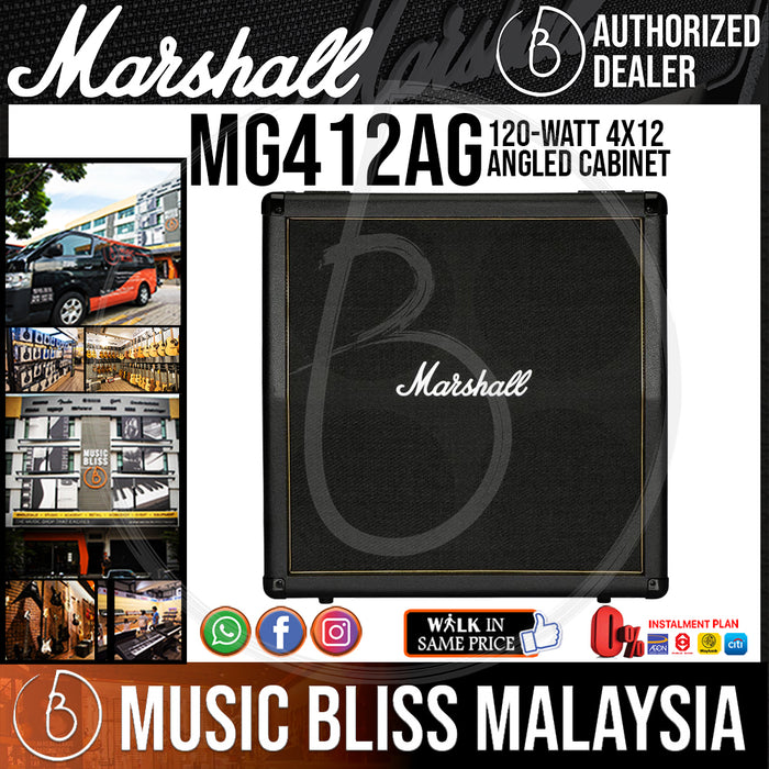 The Marshall MG412AG and your MG100HGFX head are a match made in heaven. Four Celestion G12-412MG speakers serve up a muscular British sound with open cleans, brutal crunch, and singing leads. Beyond that, the MG412AG's angled design ensures maximum sound projection. Your MG100HGFX will love this cabinet — it resonates with full lows, creamy mids, and chiming highs. Complete with the iconic Marshall logo, the versatile MG412AG is suitable for any style of music.