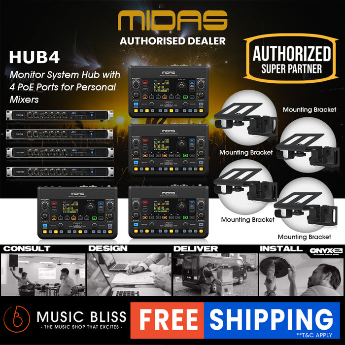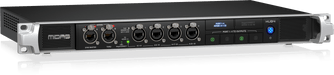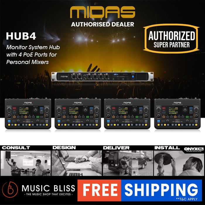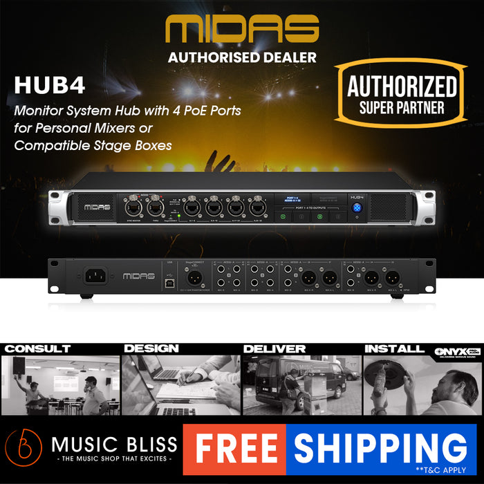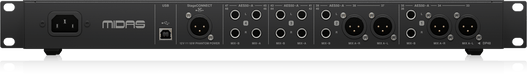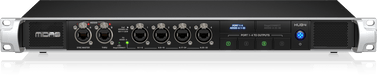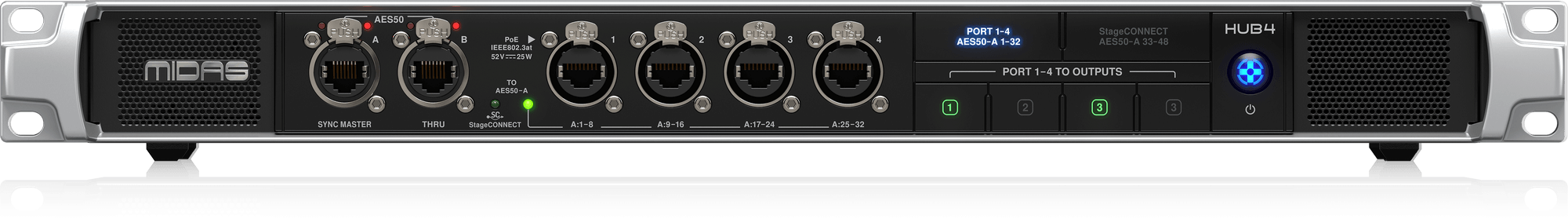 Midas HUB4 is the multi-tool in your stage rack providing analogue and digital outputs for various applications. HUB4 can supply up to four DP48 personal monitor mixers with PoE (Power over Ethernet) and 48 channels of 24-bit / 48 kHz audio. HUB4 also collects 48 channels of upstream audio and forwards this audio to the FOH console, either from stage boxes connected to the AES50-B (THRU) Port or 8 return channels from each of Ports 1-4.