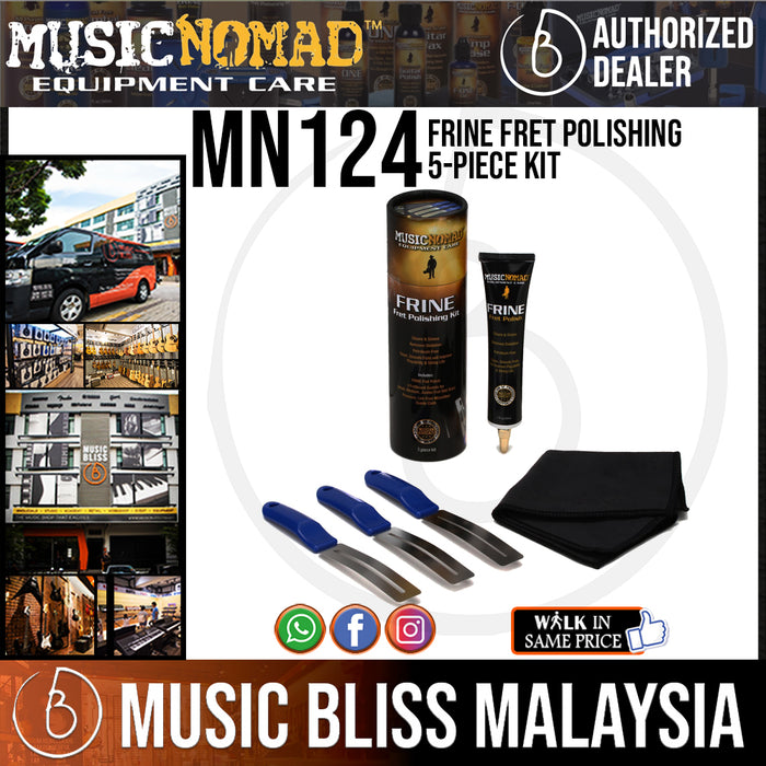 You'll feel like you have a new guitar in your hands when you use the MusicNomad FRINE Fret Polishing Kit on your favorite instrument. Use the fret polish to remove oxidation, dirt, and oil from your frets — it's safe on any type of metal. Use the included GRIP Fretboard Guards to make the job easy, then use the included microfiber suede cloth to wipe up any excess. Guitarists at Music Bliss can confirm that clean frets allow for smoother bends and vibrato while also helping your strings last longer. Make your guitar as playable as it can be with the MusicNomad FRINE Fret Polishing Kit.