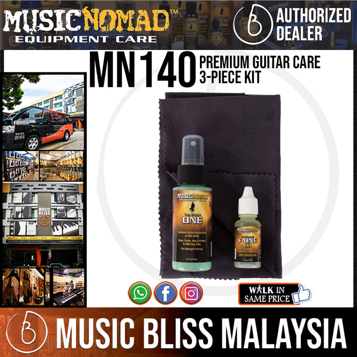 Music Nomad's Professional Grade Three-Piece Guitar Care Kit contains one each of our most popular items to care for stringed instruments. The Guitar ONE (2 oz. bottle) is an all-in-1 cleaner, polish, and wax for everyday cleaning and polishing for gloss finishes in one easy step. (Not recommended for satin/matte finishes.) Great for the body, back of neck, and finished fretboards. The streak-free, organically formulated proprietary formula has UV protectants, gloss enhancers, and even smells amazing. The 100 percent natural Fretboard F-ONE Oil (0.5 oz.) helps clean, condition, restore, and protect your unfinished rosewood, ebony, or maple fretboard and contains no lemon oil, petroleum, wax, or water. Also included is a large 12-inch x 12-inch premium suede microfiber cloth to be used with these products or by itself to clean fingerprints, sweat, dust, and grime.