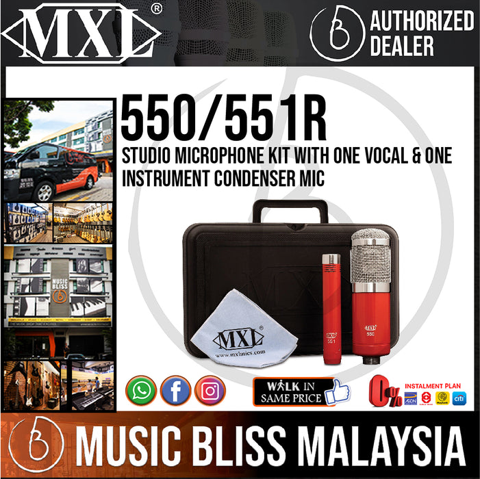 MXL 550/551R Ensemble includes the MXL 550 and MXL 551. The MXL 550 is a robust vocal condenser microphone with exceptional clarity and tonal quality. The MXL 551 instrument microphone provides the dynamic range needed for acoustic guitars, drums, high-hat cymbals, pianos, percussion, stringed instruments and more.