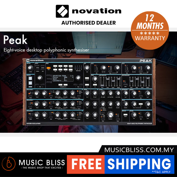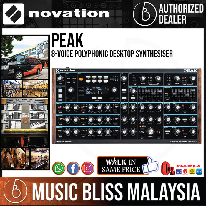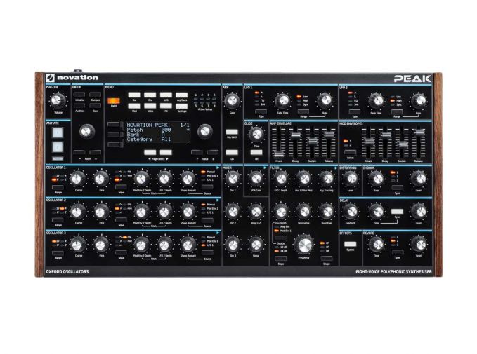 With three New Oxford Oscillators per voice, each with traditional waveshapes plus access to 17 digital wavetables, the Novation Peak 8-voice polyphonic analog synthesizer is perfect for modern electronic music producers. It's perfect for sound design too, with a 16-slot modulation matrix plus 16 direct assignments accessible directly from the front panel. Each synth voice can utilize its own analog multimode filter, with pre- and post-filter distortion available as well. Factor in built-in reverb, delay, and chorus effects, a flexible arpeggiator, and a CV modulation input for integration with modular gear, and the creative potential in the Novation Peak synthesizer module becomes obvious.