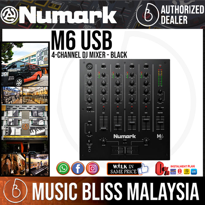 Grab a Numark M6 USB DJ mixer and the power and freedom to perform the way you want to. With four stereo channels and professional connection options, the M6 USB lets you hook up turn tables, disc players, and all kinds of DJ gear that your Music Bliss Sales Engineer would be more than happy to help you pick out. An assignable, user-replaceable crossfader with two slope selections lets you either smoothly fade between sources or snap back and forth for scratching. On top of that, you get two mic inputs, a USB connection, and 3-band EQs on all four channels. Talk about a real workhorse DJ mixer!