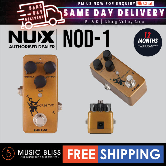 One of the most sought-after dual overdrive and boost pedals produced in the mid '90s is now available in a pocket size pedal. NuX Horseman pays homage to the legendary Centaur pedal. There are 3 dials for primary settings and 2 modes: Gold and Silver, and it offers massive headroom which usually requires an 18v input.