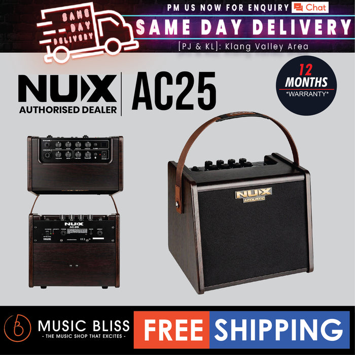 NUX AC-25 is a compact acoustic guitar amplifier with a built-in rechargeable battery that can run for up to 4 hrs. It's got a 6.5" speaker, Modeling Preamps, Reverb, Bluetooth Audio Stream and inbuilt Drum Machine. You can tweak all parameters through Stageman APP on your mobile phone.