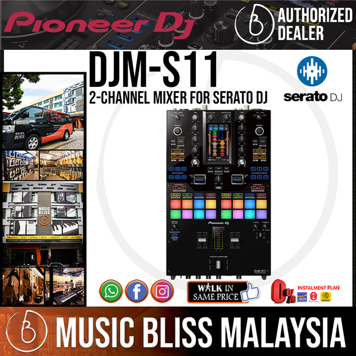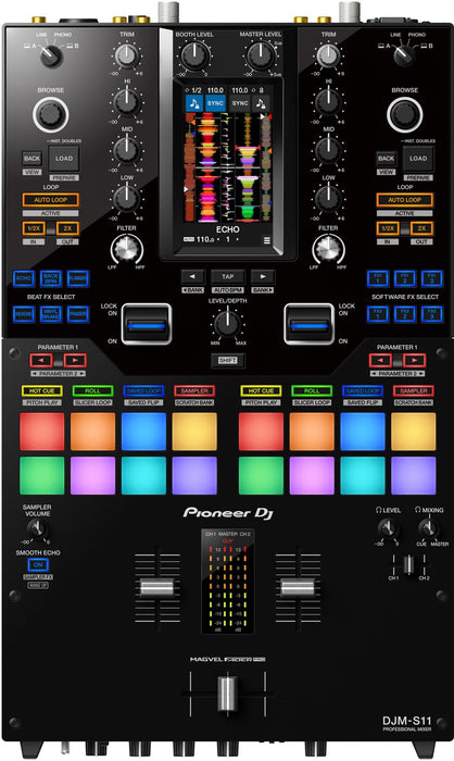 The Pioneer Pro DJ DJM-S11 mixer is the ideal centerpiece to any digital vinyl rig. It's flexible enough for club setups, robust enough for battle DJing, and loaded with two audio interfaces that are fully compatible with Serato DJ. As a standalone mixer, the DJM-S11 brings plenty to the table, including powerful EQ filtering, Filter FX, Beat FX, and a Magvel Pro crossfader that is every turntablist's dream come true. As a controller for Serato DJ, the DJM-S11 packs serious horsepower, featuring eight multi-purpose performance pads per side, dedicated effects controls with OLED labels, and two independent USB audio interfaces to make changeovers easy and battle setups epic.