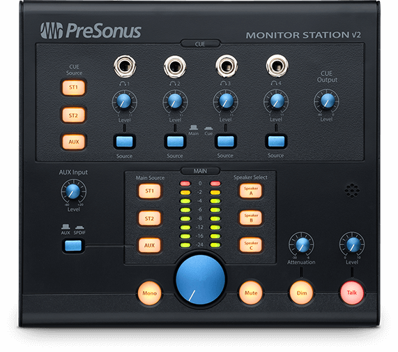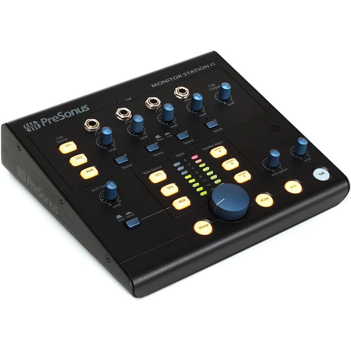 Master your monitors like the pros with the PreSonus Monitor Station V2. You get control of speaker selection, main and cue output sources, and a reliable central level meter you can easily calibrate to suit your studio. You can switch between three sets of speaker outputs with individual level control to audition mixes. The V2's four headphone outputs with level control let you route cue mixes to tracking musicians while you monitor the main mix in your control room speakers. With an updated workflow and bright LED lighting, PreSonus made the Monitor Station V2 a value packed essential for your studio.