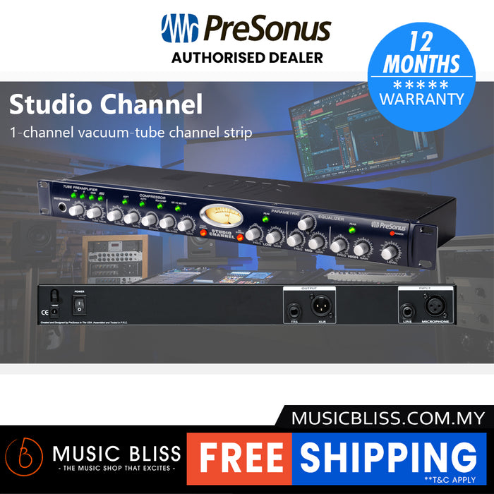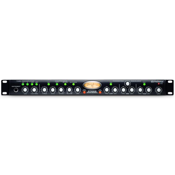 The PreSonus Studio Channel is the perfect way to step-up the quality of your recordings! This fully featured channel strip delivers a Class A tube microphone/instrument preamplifier, a variable VCA compressor, and a 3-band parametric EQ complete with VU metering - all at a ridiculously great price. If you're currently working on stock interface or mixer preamplifiers, you won't believe how incredible the same sources sound through the Studio Channel. Experience all that signature fat tube tone plus the full-on ability to tweak - the PreSonus Studio Channel's bound to become your "go-to" box!