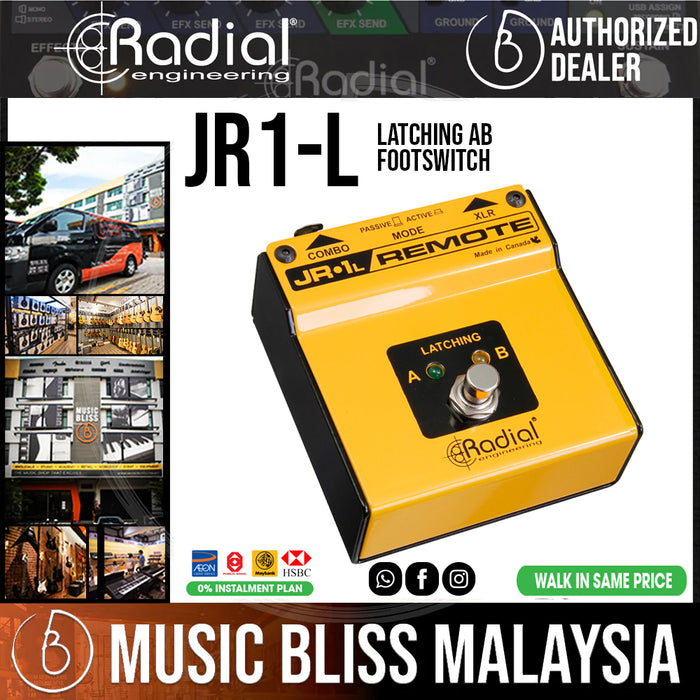 The Radial JR-1™ is a single action footswitch designed to remotely control a function such as selecting A or B outputs. As a passive device, it does not require any power to make it work. Instead, it employs a simple mechanical switch that shorts the positive with the ground using either ¼” or XLR connections. The JR1 is available in a ‘L’ latching version that requires pushing on and pushing off the footswitch to sort and release the contact, or a ‘M’ momentary version that shorts the contact when depressed, and releases as soon as the switch is released.