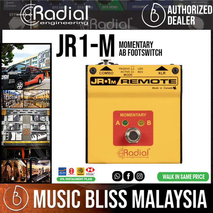 The JR1-M is a convenient momentary pedal for any gig requiring a quick function swap. Compatible with Radial’s Headbone VT, Relay Xo, and Studio-Q Radial units, the JR1-M can tap into any of these device’s power, keeping external power cables to a minimum. With connections for both XLR and 1/4-inch cables, you’ll be able to use virtually any combo of equipment with this switch, making the work of changing instruments, effects, and amplifiers simple. And with its rugged exterior, Music Bliss musicians have found that the JR1-M is able to maintain its performance even during the most strenuous performances.
