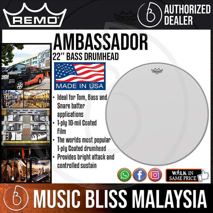Considered by many to be the industry standard, Remo's Coated Ambassador bass drumheads provide you with an exceptional balance of attack and tone - all for an amazing low price! Coated Ambassador drumheads are made from a single layer of 10-mil Mylar that's been treated to have a warmer attack, which complements its open resonance and full sound perfectly. They're excellent-sounding beater heads, no matter what style of music you play. Order yours from Music Bliss today, and discover why Remo Coated Ambassador bass drumheads are the top choice of drummers everywhere.