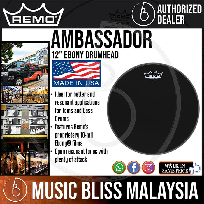 The Ambassador® Ebony® drumheads feature open resonant tones with a reflective black look. Constructed with 1-ply of 10-mil Ebony® film, Ambassador® Ebony® drumheads are ideal for batter and resonant heads for Toms and Bass Drums, and are the industry standard for Bass Drum resonant drumheads.