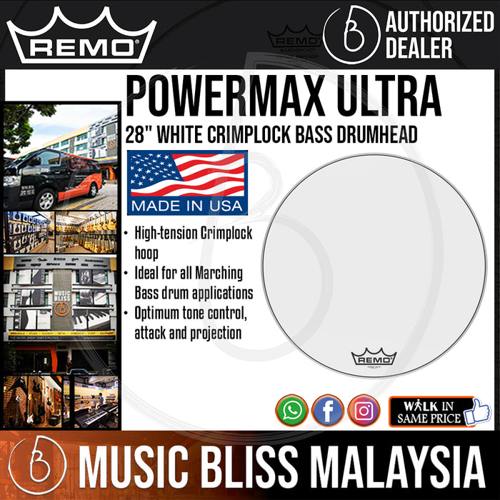 The Powermax® Ultra White Bass drumheads feature optimum tone control, attack and projection with an Ultra White finish. Constructed with 1-ply of 10-mil Ultra White film with an internal inlay ring, Powermax® Ultra White Bass drumheads feature a free-floating muffling ring with a Bottom White Dot for outstanding projection and durability. The high-tension Crimplock® hoop provides a wider tuning range and increased stability. Ideal for all Marching Bass drum applications.