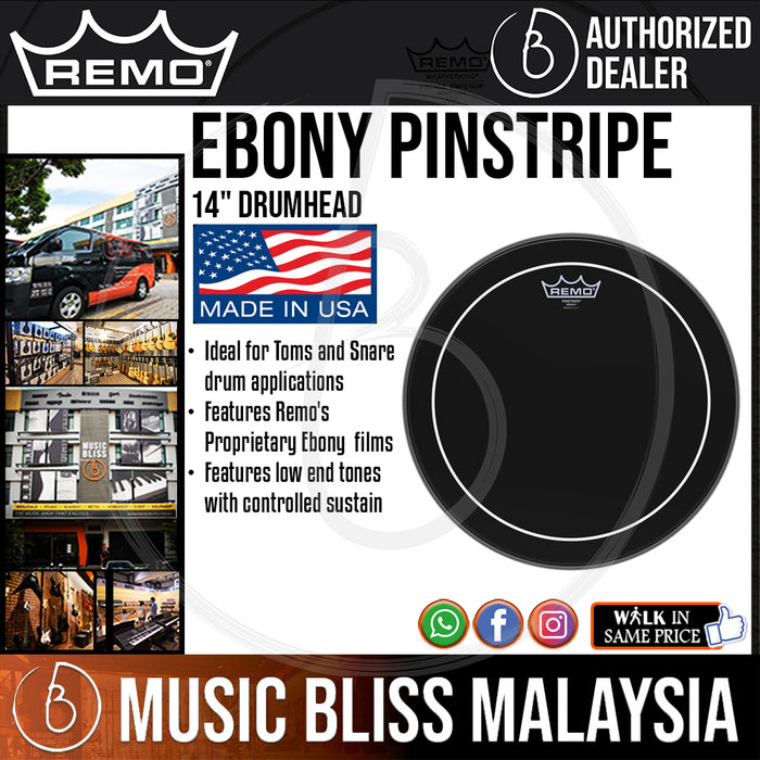 Do you take your drums deep, dark, and dead? Then Remo Ebony Pinstripes are the heads for you. Whether you play classic rock, dance, or doom metal, Music Bliss is sure you'll enjoy the punch and low-end excitement these heads impart to your whole kit. The 15-mil Ebony Pinstripe is comprised of two plies of film: on top, 10 mils of Remo's moody, reflective Ebony film; and underneath, a second layer of 5-mil clear film. These two plies in concert deliver a fat, splat-y attack on snare drums and a warm, satisfying punch on toms. Remo's Pinstripe overtone ring further damps overtones to bring out the fundamental of your drum. Music Bliss drummers love the Ebony Pinstripe's blacked-out look, which works especially nice for the stage.