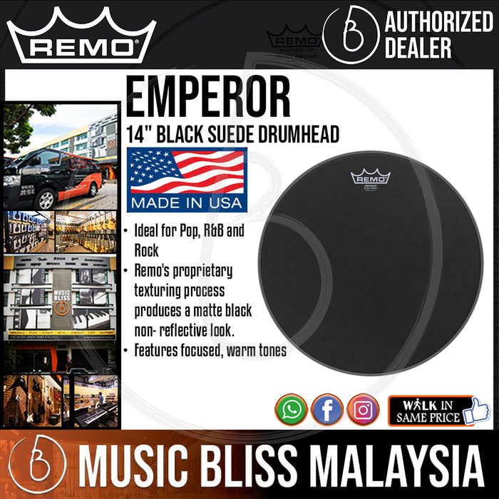 The Remo Emperor Black Suede drumhead features focused, warm tones with a soft feel and a distinctive matte black, nonreflective appearance. Constructed with two layers — the top one of 7.5-mil treated ebony and the lower layer of 7-mil clear film — Emperor Black Suede batter heads provide a full frequency range and warm attack and are particularly well suited for tom and snare drum applications. Music Bliss pop, R&B, and rock drummers love the Black Suede heads' responsive feel and unique tone.