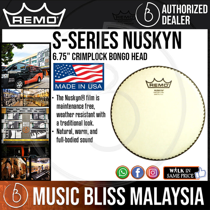 The S-Series Nuskyn® Bongo drumhead sounds natural, warm, and full-bodied with enhanced low and mid-range frequencies, without any lingering high pitched overtones. The maintenance free, weather resistant and traditional look of the Nuskyn® film also closely resembles the performance of animal skin, while actually expanding the sound response spectrum dramatically. Remo S-Series Bongo drumheads are sized to accommodate small size model Bongos with the small drum (macho) measuring 6.75 and the large drum (hembra) measuring 8”.