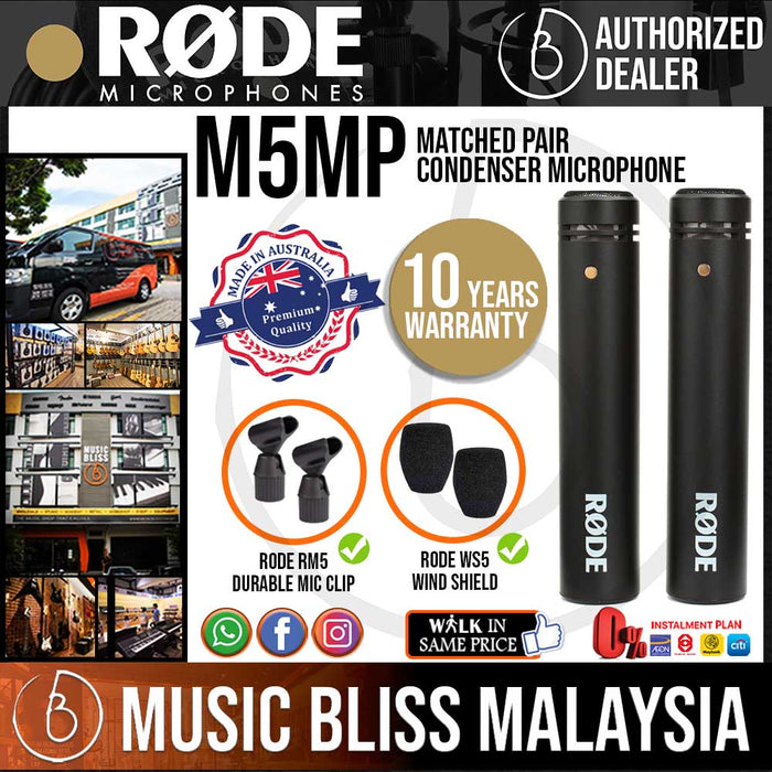 If you're looking for a pair of affordable small-diaphragm condenser microphones, take a look at the RODE M5 Matched Pair cardioid condenser microphones. These mics give you the kind of performance that will exceed what you'd expect from condensers at this price point. M5s are excellent mics for recording and sound reinforcement. They work great with guitars, percussion, strings, woodwinds, brass, and more. This matched pair is also great for stereo recording techniques. Call your Music Bliss Sales Engineer to find out more about the RODE M5 Matched Pair of cardioid condenser mics.