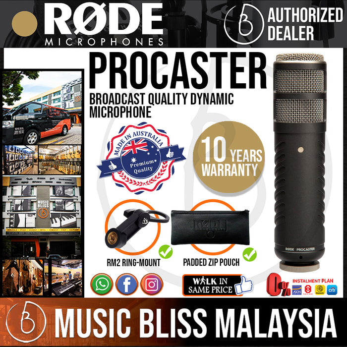 The RØDE Procaster is a professional broadcast quality dynamic microphone, specifically designed to offer no-compromise performance for voice applications in the broadcast environment.Featuring a tight polar pattern and tailored-for-voice frequency response, the Procaster is perfect for every application where a great sounding, robust microphone with superior ambient noise rejection is demanded.The Procaster features an internal pop filter, designed to minimise plosives sounds that can overload the microphone capsule and distort the audio output.Its high output dynamic capsule and balanced low impedance output make it an ideal broadcast and voice over microphone.