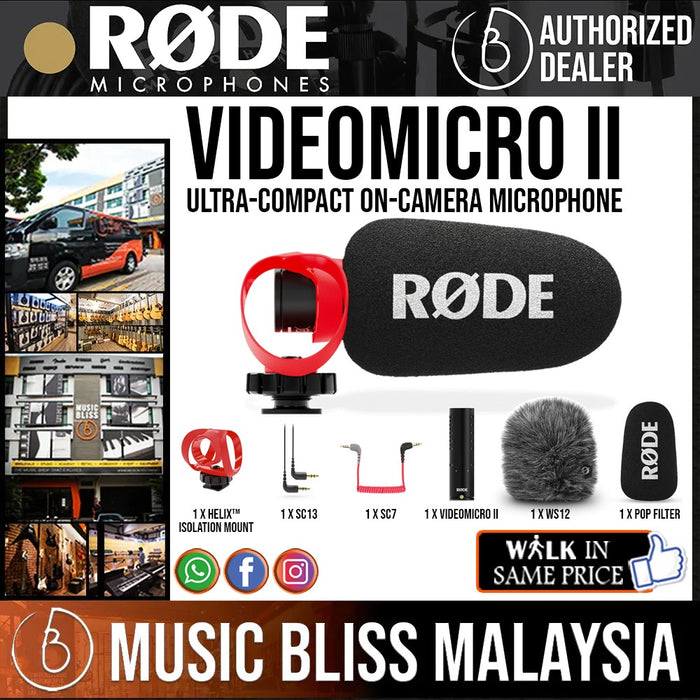 Looking to elevate the audio quality of your video production? The Rode VideoMicro II camera-mount shotgun condenser microphone delivers full-bodied sound, with a hyper-focused supercardioid polar pattern that’s ideal for recording speech and interviews. This lightweight and compact microphone boasts a cutting-edge HELIXTM isolation mount system that all but eliminates the handling noise that can often be a challenge when recording with camera-mount microphones. What’s more, the VideoMicro II is a breeze to use — simply connect to your camera or smartphone with one of the included TRS patch cables and start recording. A set of deluxe foam and furry windshields complete the package, adding up to a powerful camera-mount microphone that’s a must-have for content creators searching for a plug-and-play way to achieve top-tier sound.