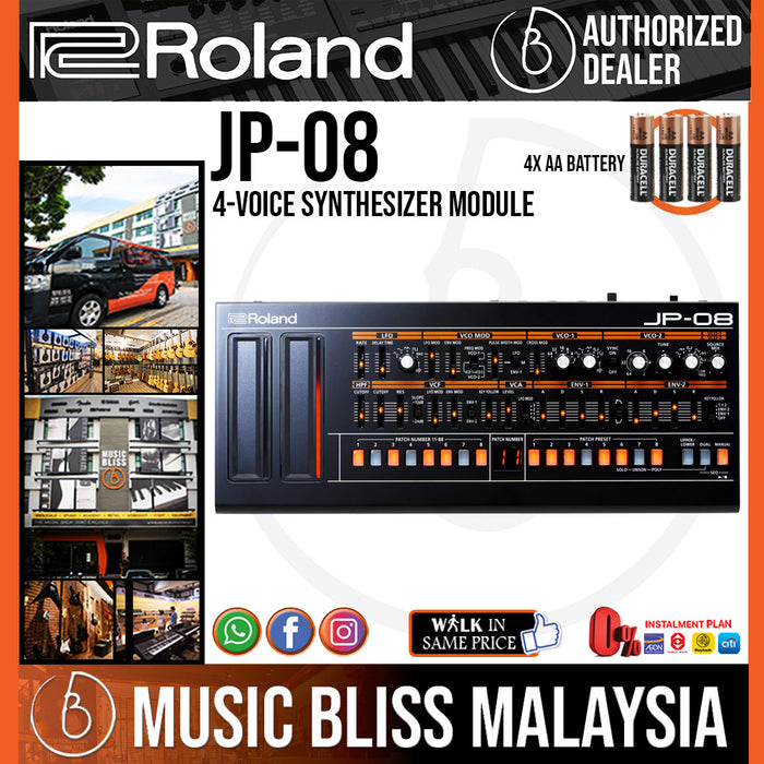 Roland Jupiter-8 synthesizer is backin the JP-08 sound module. Part of Roland Boutique Series of synth modules the JP-08 uses Roland Analog Circuit Behavior modeling to faithfully re-create the tone and sound-design potential of one of the world most iconic synthesizers. And even synth purists are pleased to see some welcome enhancements such as more LFO waveforms and expanded VCO range. You get ample hands-on control a built-in 16-step sequencer and true portability. Best of all the Roland JP-08 four-voice synth module sounds as huge as the original Jupiter did.