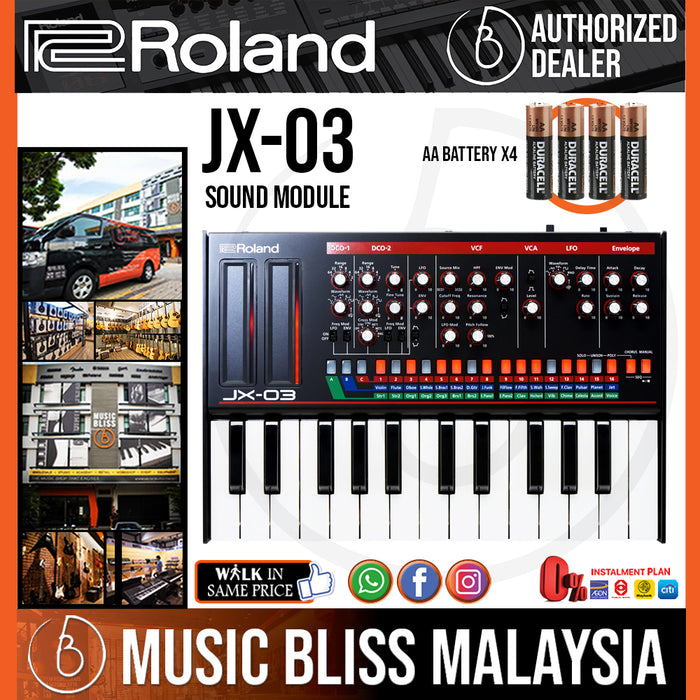 The Roland JX-03 gives you the sound and control of the company classic JX-3P synthesizer in a compact module with battery operation and a built-in speaker so you can be creative anywhere. A member of Roland limited-edition Boutique range this little 4-voice powerhouse retains the distinctive sonic character feel and user interface of the JX-3P. As did its progenitor the JX-03 offers immediate push-button access to presets and for instant sound sculpting the front panel has all 24 knobs from the original PG-200 controller. Also onboard the Roland JX-03 are new waveforms and cross-modulation options as well as an expanded range for its two digitally controlled oscillators.