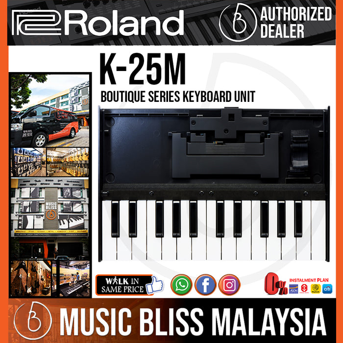 If you have a Roland Boutique Series synth we would like to recommend a must-have accessory. Roland K-25m is a 25-note velocity-sensing keyboard designated for use with the company Boutique Series synth modules. Less than 12" across the K-25m is an ultra-portable input solution that also acts as a dock for the JU-06JP-08JX-03 and VP-03 models. Once positioned you have a choice of tilting the module at two different angles for easier viewing and sound program mingor having it lie flat. The Roland K-25m addresses a pitch range of -4 to +5 octaves when teamed up with a Boutique Series synth.