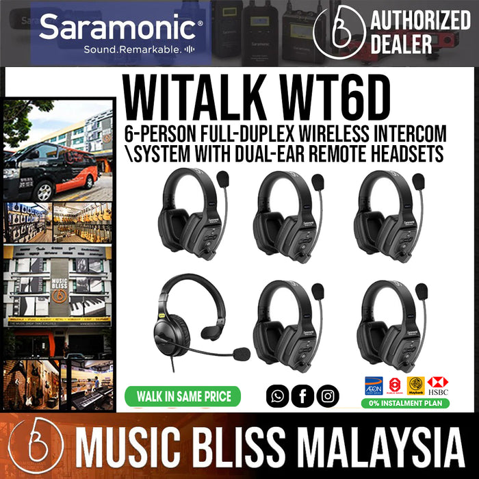 The Saramonic WiTalk-WT6D is a 6-person full-duplex dual-ear 1.9GHz wireless headset and Hub Base Station intercom system for professional production teams. Ideal for multi-person film, television, stage, photo shoot, and sports productions. Its hands-free design enables a crew to communicate wirelessly, while being able to work unencumbered, moving freely throughout the venue or location. It features a remarkable line-of-sight range of up to 1312-feet (400m) and extended battery runtime, giving your team the range and power needed to get through a day’s production. The entire system is completed with a rugged water-tight custom hard case for travel and storage. True Full-Duplex Operation with Simultaneous Communication for 6-People Unlike some intercom systems that say they are full duplex, the WiTalk-WT6D is a real full-duplex intercom system. Allowing your team of up to 6 people to simultaneously communicate at any time. There are no limitations and how many people can speak at the same time, letting your team communicate efficiently and not have to wait for another user to stop talking. Much more powerful and effective then walkie-talkies, other two-way systems, and other “full-duplex” intercoms that limit your communication to 1 to 2 users at a time. Lightweight and Comfortable Headsets with Adjustable Boom Mic Arm and Rotatable Ear Cups The WiTalk-WT6D adjustable dual-ear headsets and the WiTalk-LBH wired headset are all designed to be incredibly comfortable and extremely lightweight.