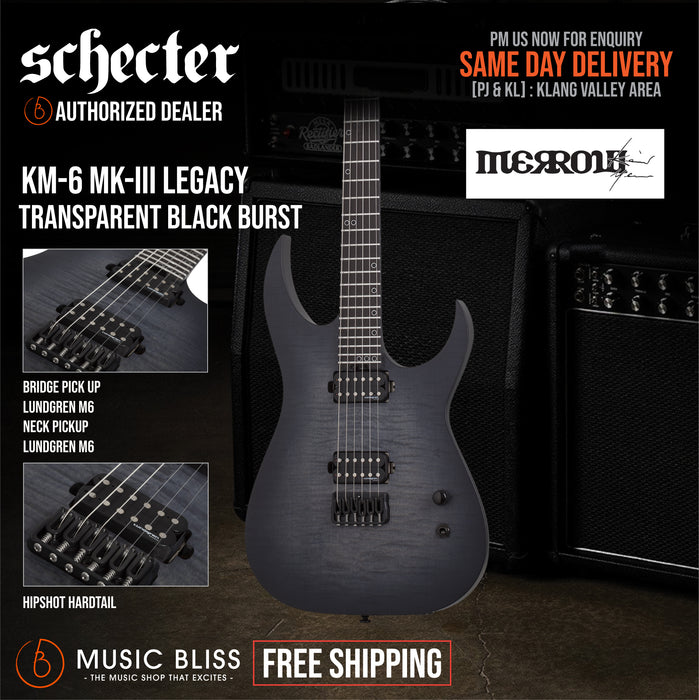 The Schecter Keith Merrow signature KM-6 MK-III Legacy is designed for the technical and aggressive player looking for a premium guitar with premium specifications. Armed with high output Lundgren M6 humbuckers, the KM-6 MK-III Legacy belts out shockingly brutal tones with a surprising amount of clarity. Neck thru body construction provides sustain and stability and the best playing experience possible. The KM-6 MK-III Legacy comes loaded with a Hipshot hardtail bridge, machined from solid brass, polished and plated, and is among the most finely crafted bridges on the market today. Other high end features of the KM-6 MK-III Legacy are Schecter locking tuners, compound fretboard radius, Ernie Ball Compensated nut (right handed models only), and Luminlay glow in the dark side dot markers.