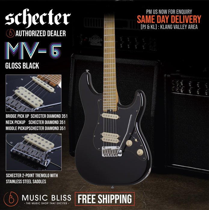 Don’t let the Schecter MV-6’s modest looks fool you — this unique powerhouse axe is set for stun! The MV-6’s 24-fret fingerboard, “Thin C” neck profile, and contoured neck heel offer maximum range for solos and riffs while keeping your playing fluid as can be. Extra-jumbo fingerboard frets ensure smooth, seamless bends and a 2-point tremolo system can kick your solos up a notch with wails and dives. But these player-focused features are onboard to support the MV-6’s real star: a modified 5-way “HS” pickup system powered by three Diamond 351 single-coil pickups. This “HS” configuration delivers that must-have bridge humbucker tone without sacrificing your ability to switch to true single-coils on a whim. Moreover, the MV-6’s middle position offers a modified take on “middle” pickup tone, a favorite for soaring solos onstage and in the studio. If you’re in search of a stealthy axe that shreds seamlessly but blends into a crowd, the Schecter MV-6 from Music Bliss is calling your name!