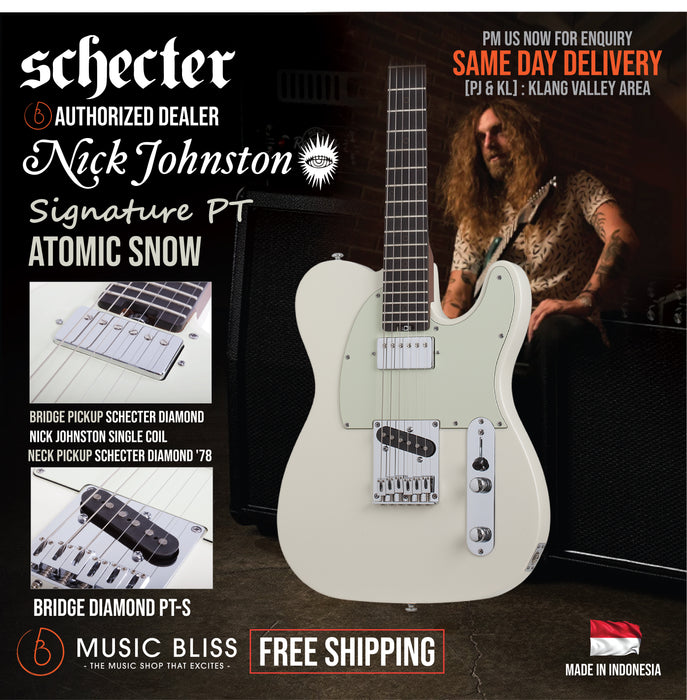Top-quality tonewoods, fine-tuned electronics, and a decidedly vintage soul solidify Schecter's Nick Johnston Signature PT electric guitar as a fantastic workhorse for classic rockers who demand versatility that more than handles the virtuosic playing of its namesake. Its alder body and maple neck will feel familiar to T-style players everywhere, delivering the chunky mids and prominent lows that helped skyrocket this tonewood in popularity over the years. Its vintage "C"-shaped roasted hard rock maple neck is capped with silky ebony for effortless fretting from head to heel. Music Bliss players especially love the PT's Schecter-designed pickups, with a single-coil in the bridge for some welcome twang and a humbucker in the neck for thick, full-bodied tones in complete clarity. This 6-string's locking tuners and Diamond PT-S bridge make string changes a breeze while keeping everything perfectly in tune, a crucial factor when needing a reliable instrument when out on the road. Prepare to dive into the "Atomic Mind" of Nick Johnston with his Schecter Signature PT!