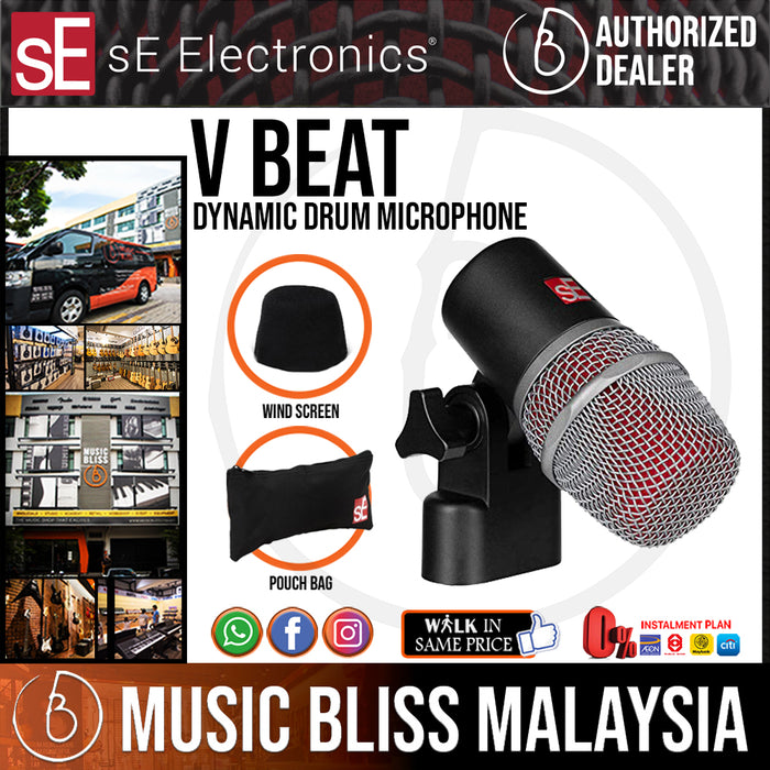 Designed for use on snare and tom toms, the sE Electronics V Beat is the most compact drum microphone in its class. The V Beat's purpose-built capsule delivers an extremely natural and highly detailed sound on snare drums or toms of any size. It features impressive off-axis rejection to minimize spill from proximate drums and cymbals. The V Beat's ultra-compact design and parallel XLR connector/stand mount give it an extremely small footprint, and its rock-solid swivel mount lets you position it with great precision — aiming it at any part of the drum head to achieve the desired sonic character. And paired with sE's optional V Clamp (sold separately), the V Beat is even quicker and easier to position. Music Bliss take: as a versatile, punchy-sounding snare and tom mic, the V Beat is hard to beat.