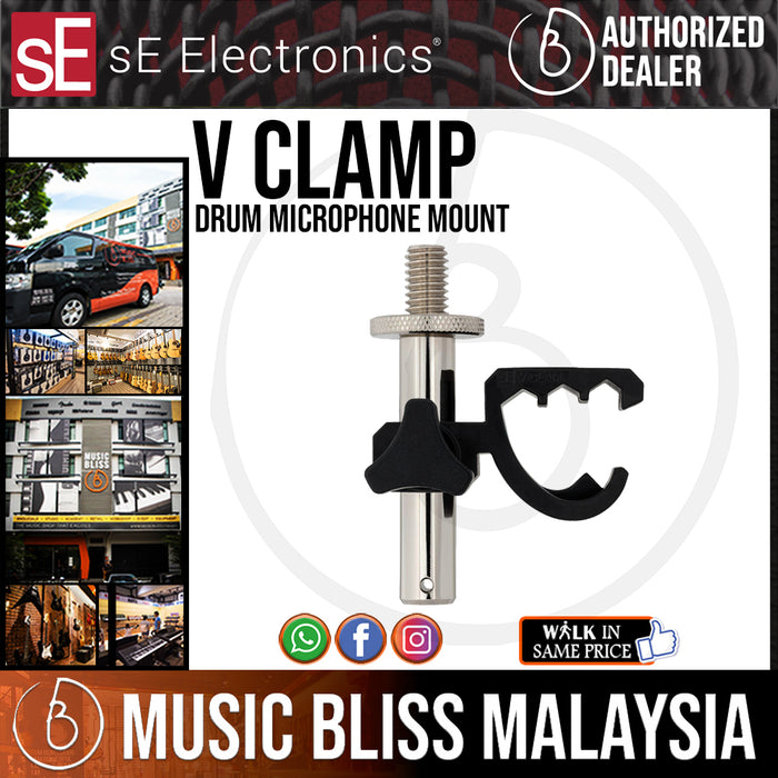 Compatible most snare drums and toms on the market, the sE Electronics V Clamp is an amazingly fast, compact, flexible, and practical drum mic mounting system. sE designed it as the the perfect companion to their V Beat for snare and tom miking, but it's also compatible with many other popular mics. Its rugged elastic clamp enables setup and teardown in seconds, and its robust, roadworthy design is built for years of hard-core touring. Loosening the V Clamp’s knob and adjusting the position of the rod lets you quickly adjust the height and rotation of the connected microphone, allowing positioning for any desired drum sound, or to minimize bleed from nearby drums. Music Bliss advice: the sE Electronics V Clamp is incredibly fast and painless to use. A no-brainer!