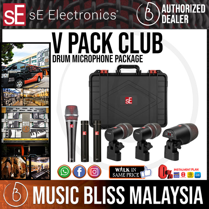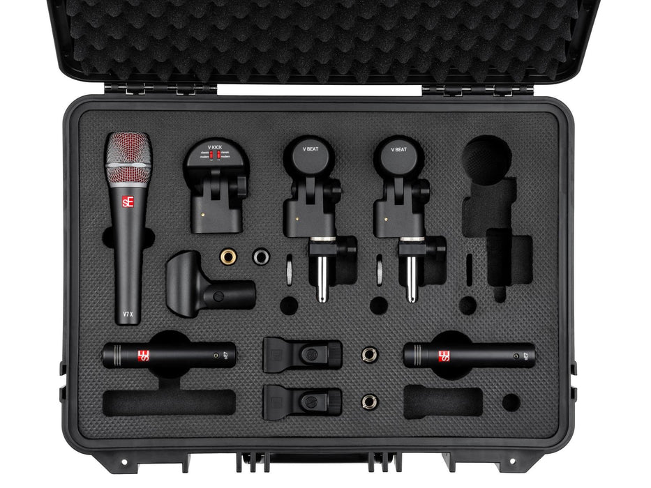 sE Electronics’ V Pack Club gives you all the microphones you need to mic up a drum kit and make it sound great. You get one V Kick dynamic bass drum mic, two V Beat dynamic tom mics with V Clamps, one V7 X supercardioid dynamic instrument mic for snare, and a pair of sE7 small-diaphragm condenser mics for overheads. All the mics and accessories come in a roadworthy plastic flight case that has an empty berth for your favorite hi-hat mic.