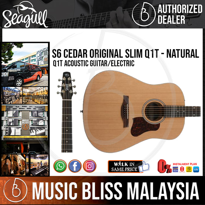 Seagull's S6 Original Slim Q1T acoustic guitar offers smooth playability and great tone at an exceptional value. Its pressure-tested solid cedar top, three-layer wild cherry back and sides, and silver leaf ample neck combine to give you a warm, detailed tone. Seagull's modified dreadnought body shape eliminates unwanted boominess and gives you a full-range tone that's great for all styles of music. The integrated set neck and compound curved top offer increased tuning stability, resonance, and projection. And with a slightly shorter nut width of 1.72", the S6 Original Slim Q1T is great for beginners or players with smaller hands. The S6 Slim also comes with Godin Q1T electronics for stellar amplified tone. Long known as a great value in the guitar world and appreciated here at Music Bliss, the Seagull S6 Original Slim Q1T is an affordable guitar with great features! Guitarists here at Music Bliss really appreciate its quality and affordability.