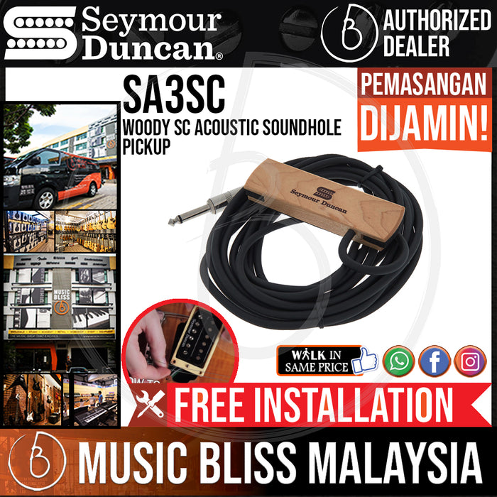 Seymour Duncan's Woody SC SA-3SC is the perfect no-fuss solution for instant on-stage amplification of an acoustic guitar. Just pop the SA-3SC into the sound hole and you've got a great-sounding pickup with a beautiful maple cover. Plug into any acoustic guitar amp, PA, or mixer using the studio-quality 14' cable and start strumming. The Woody SC SA-3SC provides warm, rich tone that's perfect for chords or finger style playing. Get the most from your acoustic with Seymour Duncan's Woody HC SA-3SC!