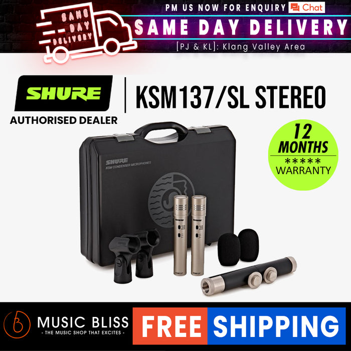 The Shure KSM137 is an end-address condenser microphone with a cardioid polar pattern. Designed for studio use, yet rugged enough for live applications, the KSM137 can withstand extremely high sound pressure levels (SPL). Its low self-noise and extended frequency response make it ideal for recording musical instruments.
