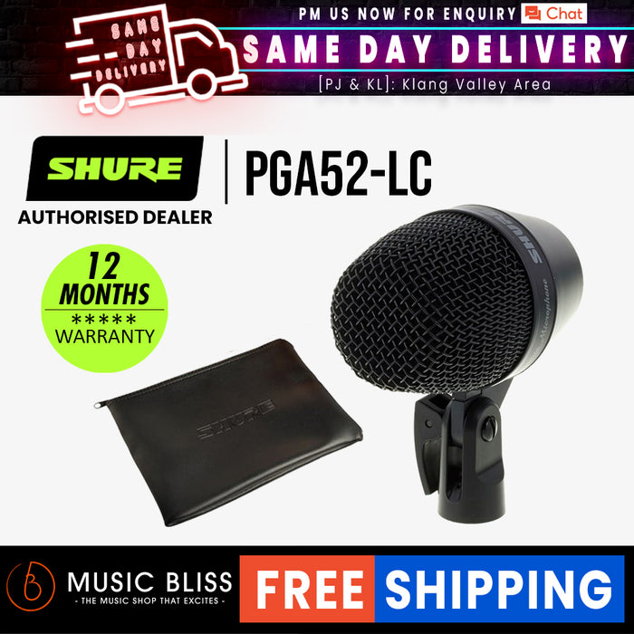 Record kick drums and bass amps that kick like a mule with the Shure PGA52 dynamic microphone. It's tuned for extremely solid low frequency response, and it'll capture the power of your source with exceptional focus and accuracy. Use the handy swivel joint to find the perfect angle in relation to your sound source. The handy quick release latch makes setup and teardown a snap. Recording engineers at Music Bliss have turned Shure microphones for years, and the PGA52 dynamic mic presents a solid recording solution at an affordable price.