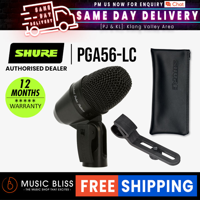 Tap into Shure quality and value with the PGA56 dynamic microphone, an affordable solution for capturing snare drums, toms, and other high-impact sound sources. Get a gang of them to outfit your drum kit at school, church, or in your rehearsal space. Recordists and drummers at Music Bliss have long turned to Shure microphones for their durability and sound quality. When you need to mic up an acoustic drum kit for live performance or recording in your studio, you can expect clean, consistent results from the Shure PGA56 dynamic mic.