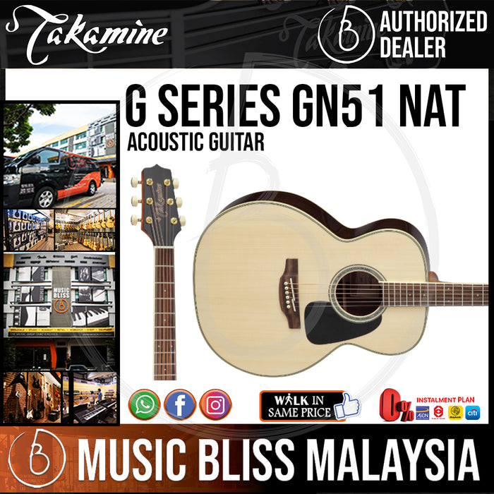The Takamine GN51 acoustic guitar will seduce you with its rich tone, stunning good looks, and amazing playability. Sporting a solid spruce top and rosewood back and sides, the GN51's cutaway NEX small jumbo body is incredibly comfortable, even for smaller players. The GN51's solid spruce top responds beautifully to a light, finger style touch, yet will sing with authority when strummed boldly. If you're in the market for a versatile, comfortable, great-sounding acoustic, check out Takamine's GN51.