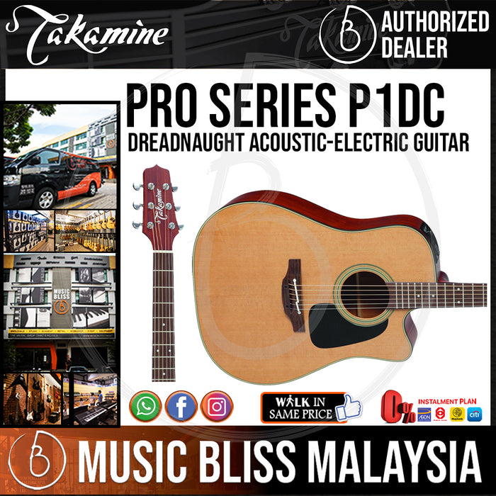 The Takamine Pro Series P1DC Dreadnought Acoustic-electric guitar rewards you with its mellifluous sonority, understated good looks, and buttery playability. Pick it up, take the fast mahogany neck in your hand, strum a few chords, and revel in the harmonic richness resonating from the solid cedar top. Execute a single-note run, let your fingers fly all the way up the bound rosewood fingerboard - courtesy of the P1DC's Venetian cutaway. Plug it in, and experience pure amplified acoustic tone, the way it was meant to be heard. The Takamine Pro Series P1DC - to play it is to love it.