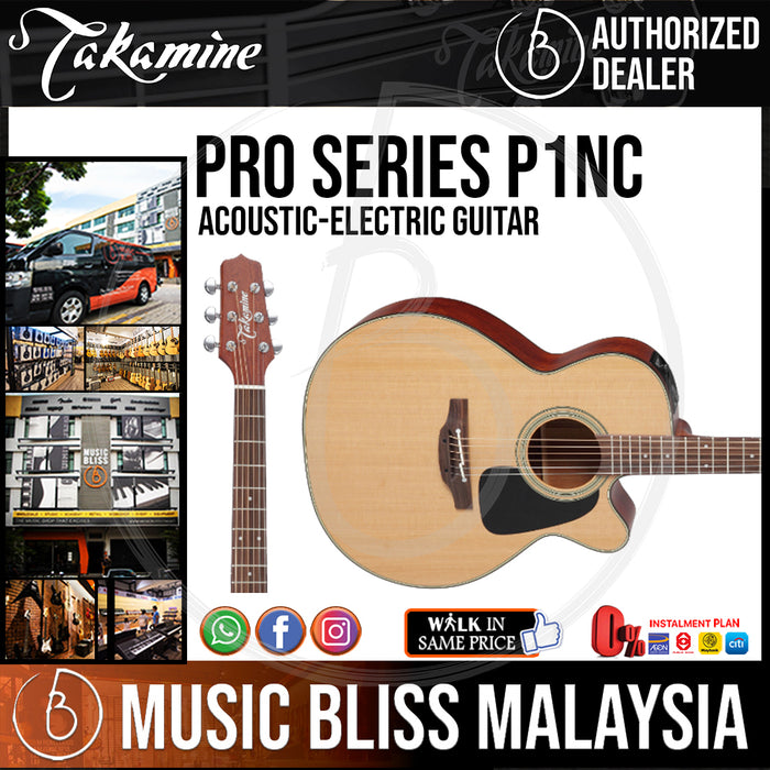 The Takamine Pro Series P1NC Acoustic-electric guitar rewards you with its mellifluous sonority, understated good looks, and buttery playability. Grab the fast mahogany neck, strum a few chords, and revel in the harmonic richness resonating from the the NEX/grand auditorium body and solid cedar top. Execute a single-note run, let your fingers fly all the way up the bound rosewood fingerboard - courtesy of the P1NC's graceful Venetian cutaway. Plug it in, and experience pure amplified acoustic tone, the way it was meant to be heard. The Takamine Pro Series P1NC - to play it is to love it.
