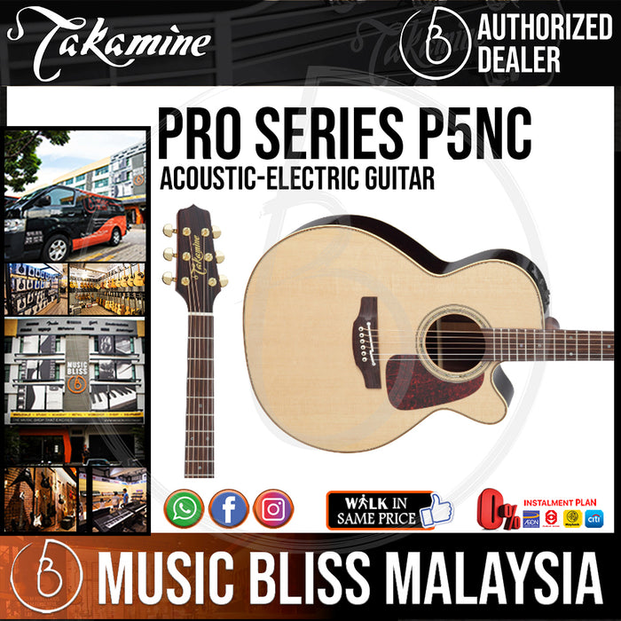 Thanks to its NEX body, the Takamine P5NC acoustic-electric guitar has the bold tone of a dreadnought while leaving ample sonic space for your voice. The solid spruce top with scalloped "X" bracing gives your tone amazing balance and articulation. Solid rosewood back and sides generate rich harmonics, picked up perfectly by Takamine's CTP-3 Cooltube preamp system. The P5NC is a performer's delight, an instrument you can truly count on at every gig. And thanks to smart touches like the asymmetrical neck profile for smooth playability, and the split bone saddle for better intonation, you can rely on the Takamine P5NC acoustic-electric guitar for top-notch performance.