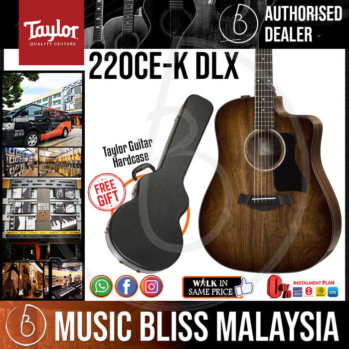 The Taylor 220ce-K DLX is one of those acoustic-electric guitars that sounds better every time you play it. Its all-koa construction offers a crisp snap with strong mids and sparkling highs that will become richer, sweeter, and more resonant with age. And playing this guitar often won't be a problem, by virtue of its comfortable sapele neck. Experience top-shelf amplified tone, courtesy of the onboard ES2 electronics. In addition to its striking koa body, the 220ce-K DLX also features eye-catching black binding, a single-ring faux pearl rosette with interlocking "fishbone" pattern, and Italian acrylic, small diamond fingerboard inlays.